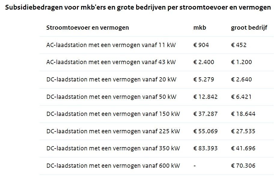 Het subsidie bedrag voor de laadpalen hangt af van de omvang van je bedrijf en het type laadpaal dat de voorkeur heeft. Voor het MKB is er een maximale subsidie van 40% op de totale projectkosten voor het installeren van de laadpalen, terwijl grote ondernemingen maximaal 20% kunnen ontvangen. Voor eventuele advieskosten is er 50% subsidie beschikbaar tot een maximum van €3.500,-. Voor een overzicht van de subsidie per laadpaal zie het overzicht dat door het RVO beschikbaar is gesteld.